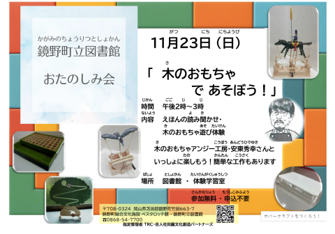 11月のおたのしみ会は「木のおもちゃであそぼう!」です。絵本の読み聞かせや、木のおもちゃアンジー工房・安東秀幸さんといっしょに木のおもちゃに触れて遊びましょう。かんたんな工作もあります。