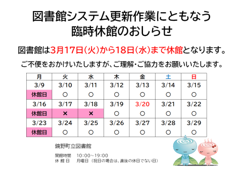図書館システムの更新作業のため3月17日(火)から18日(水)まで、図書館は臨時休館となります。この期間、インターネットからの予約や検索なども休止となります。